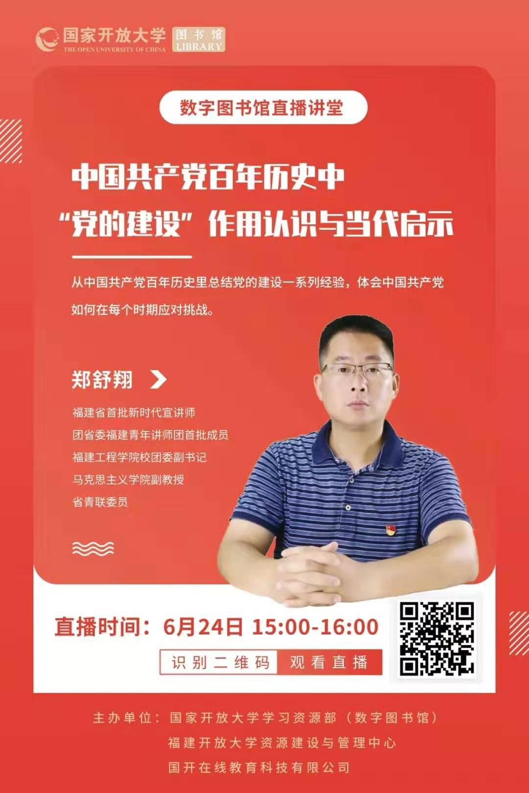 在中国共产党百年历史进程中,中国人民在党的领导下,冲破重重难关,夺取了一个又一个胜利,其中“党的建设”发挥了举足轻重的作用,6月24日下午,“论道•启思”沙龙活动第六季第六讲邀请福建省首批时代宣讲师、福建工程学院团委副书记郑舒翔副教授为大家带来“中国共产党百年历史中‘党的建设’作用认识与当代启示”主题沙龙。本场活动现场由学生工作处黄生春副主任主持。职业学院40余名同学踊跃参加。活动通过“国开学习网”直播平台,面向开放大学体系师生同步直播。