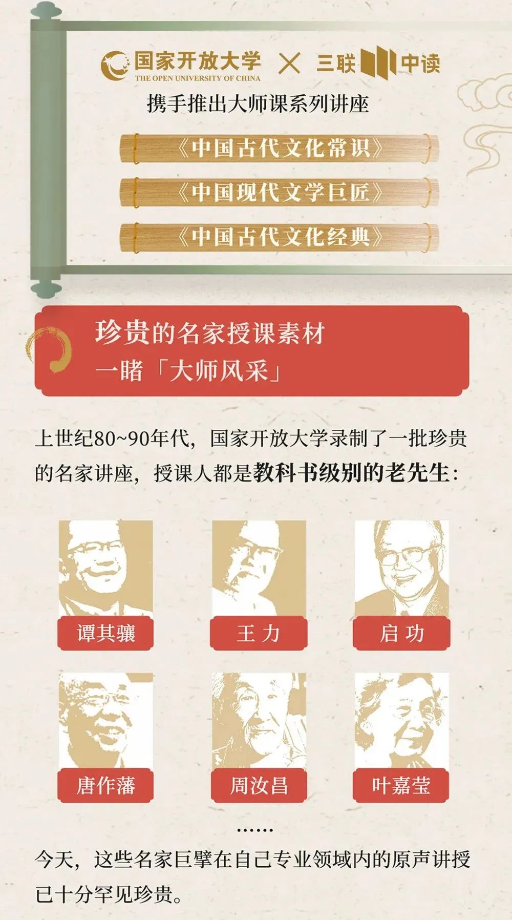 4月23日,在第29个世界读书日到来之际,国家开放大学与三联中读联合推出的“中国文化”大师课系列课程正式上线。