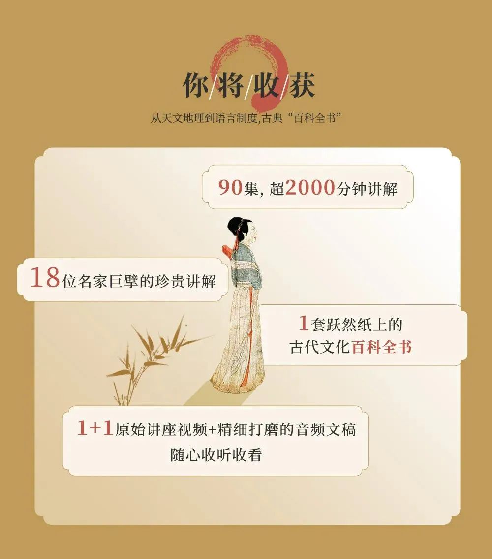 本次“中国文化”大师课,将陆续推出三门课程——“中国古代文化常识”“中国古代文化典籍”和“中国现代文学巨匠”。课程内容囊括天文历法、历史地理、宗法礼制、金石书画、目录学、音韵学等领域。此外,我国古代经典典籍选讲、现代文学代表人物概说等也收入其中,系列课程融知识性、思想性、学术性、资料性为一体,展现了中国古代文化的博大精深。