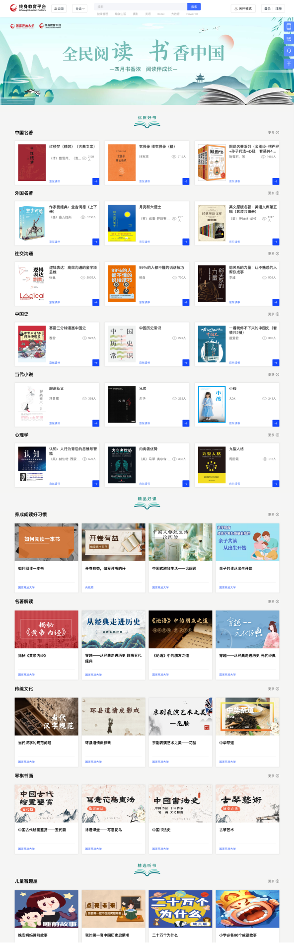 在第29个世界读书日到来之际,为深化全民阅读活动,国家开放大学(国家老年大学)继续遴选优质读书资源,在学习网平台、终身教育平台、老年教育平台同步上新,上架新书3000余册,实现图书总量10000册,服务用户触达3000万。同时,针对学历教育学生、在职成人和老年群体,推出专题栏目,形成不同推荐矩阵,分别展现“优质好书”推荐和“精品好课”推荐,定期更新,为读者推送高质量、个性化学习资源。