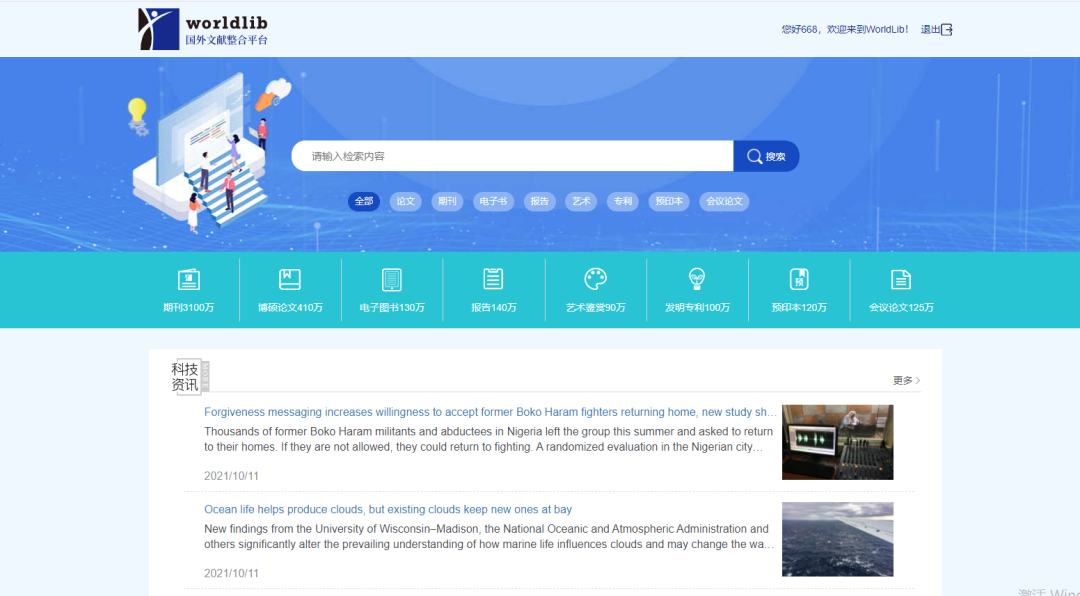 平台在全球范围内收集、整理高质量开放数据文献,按照文献类型分为8个专题库,其中期刊3100万篇(期刊品种不少于30000种)、国外博硕士论文410万篇、科技报告140万篇、艺术图片90万幅、外文电子图书及章节130万、专利100万篇、会议论文125万篇、预印本120万篇,共计4200多万国外优秀文献。8个文献专题库可以在一个平台上实现一站式跨库检索。