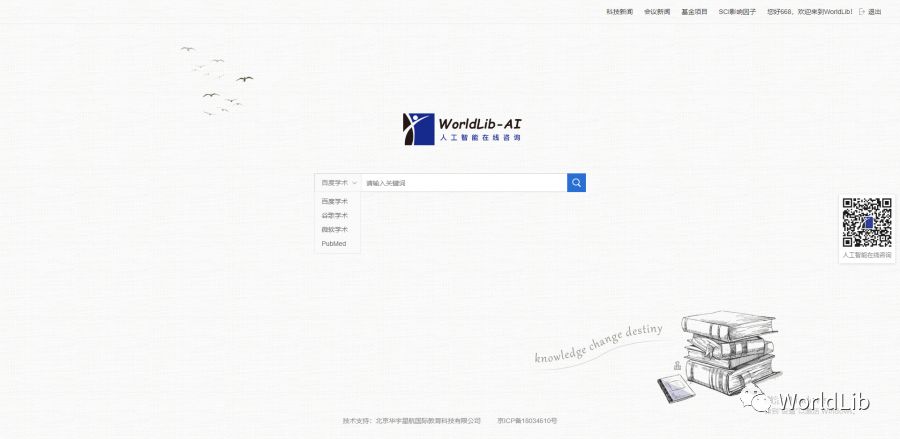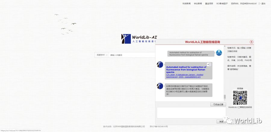 worldlib人工智能在线咨询平台是一款以网页和微信为载体,运用最新网络技术接入多个搜索引擎为广大师生提供外文文献获取的互联网在线服务平台。该平台支持关键词检索、题名检索(文献准确题名)、文献DOI号检索、文献PMID号检索、图片识别检索、作者检索。查询结果会在10秒内返回,24小时不间断的提供文献查询服务。