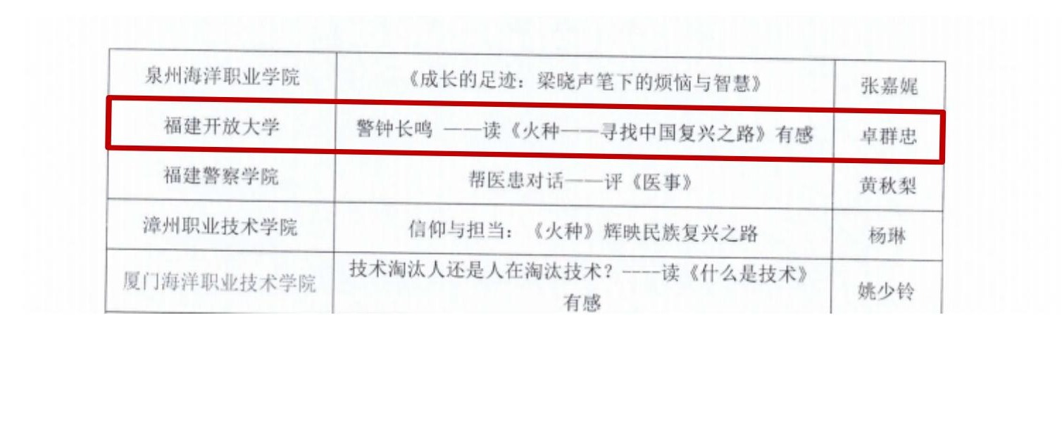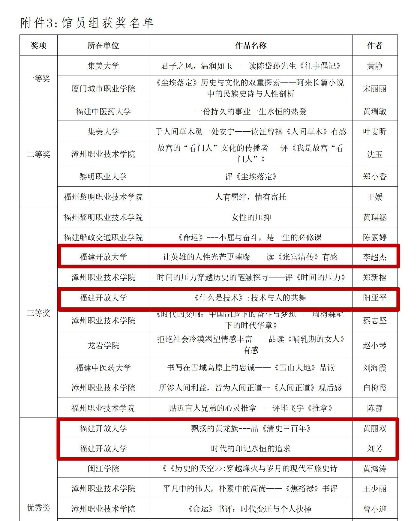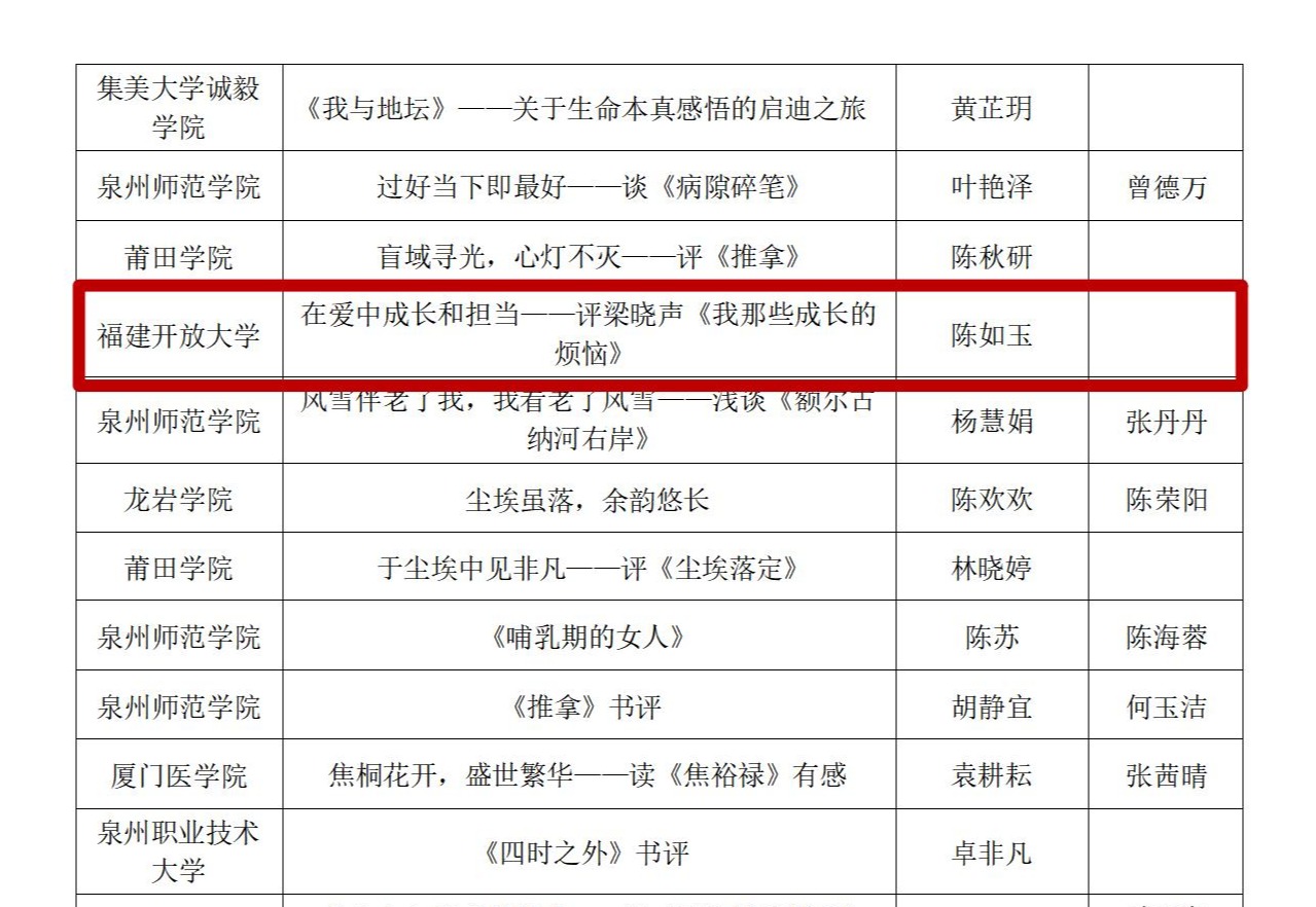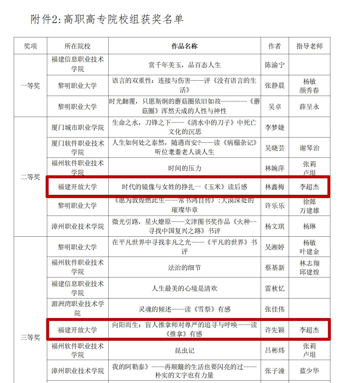 近日,由福建省高校图工委、福建省高校数字图书馆(FULink)联合主办的“书香校园”立体阅读活动暨第七届福建省大学生书评大赛圆满落幕。我校推荐的8篇师生佳作全部获奖,其中二等奖1篇、三等奖3篇、优秀奖3篇及入围奖1篇。