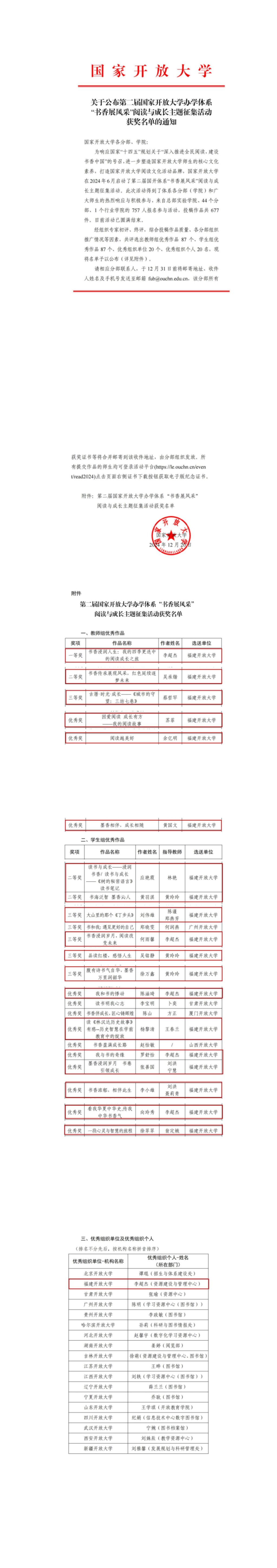 在国家开放大学第二届国家开放大学办学体系“书香展风采”阅读与成长主题征集活动中,福建开放大学全省体系师生积极参与,表现出色共斩获包括教师组一等奖、学生组二等奖在内19个奖项,是国开办学体系中获奖最多的分部。因组织得力、成绩显著,学校获得优秀组织奖。