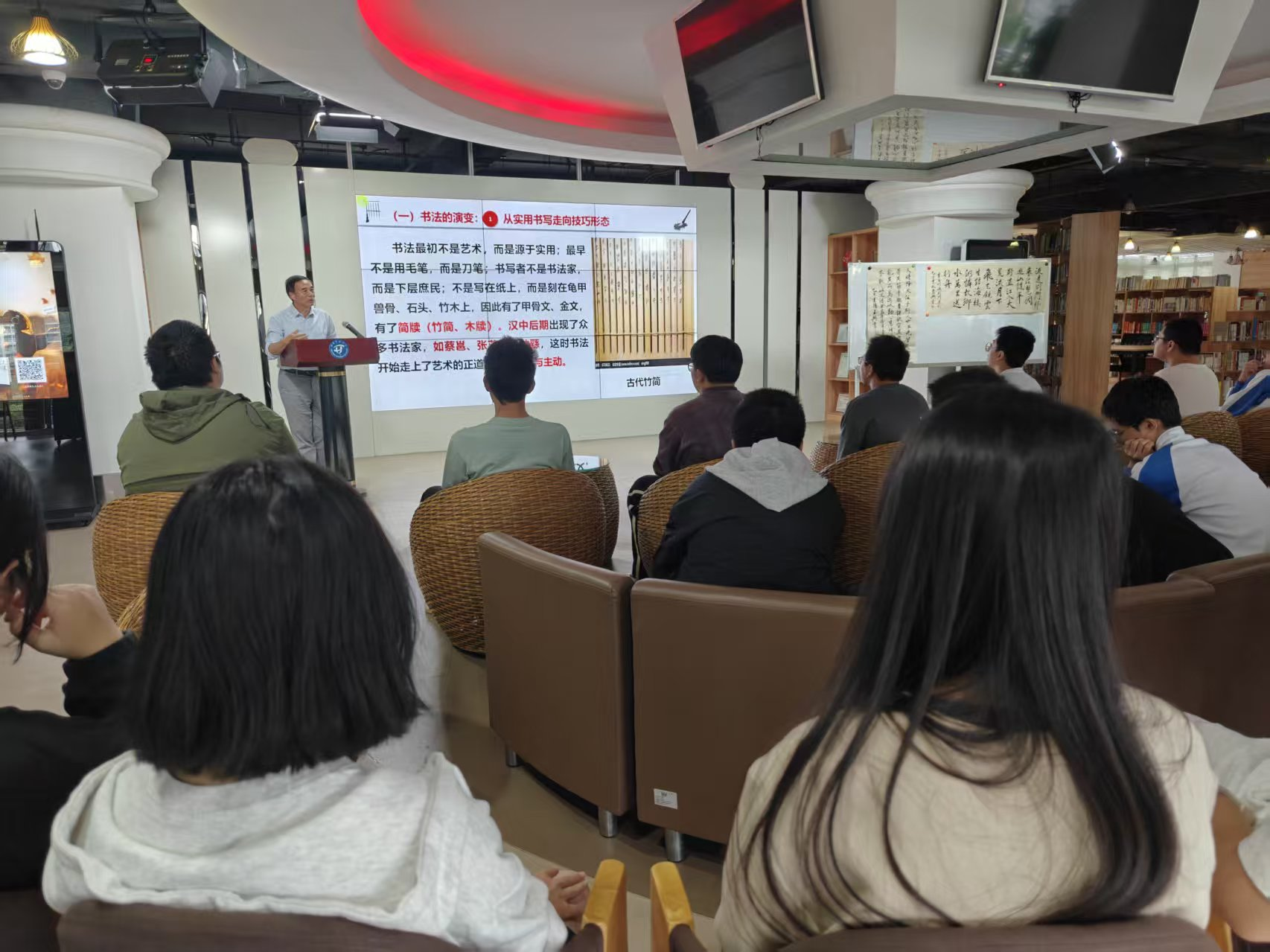 为进一步弘扬中华优秀传统文化,提升师生对书法艺术的认知与欣赏能力,10月30日下午,图书馆“论道・启思”沙龙活动邀请学校原文经学院刘玉兴副教授作为主讲嘉宾,在明德楼三楼数字学习体验中心举办“学习书法艺术 陶冶高尚情操”主题沙龙活动。职业学院30余名同学参加了本次活动。