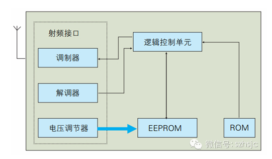 电子标签(Tag),是射频识别系统真正的数据载体。每个电子标签都有唯一的电子编码,一般附在所要监测的物体上通过电磁波与读写器进行无线数据交换,具有智能读写和加密通信的功能(如图 3)。电子标签接收读写器发来的信号,并将其一部分整流为直流电源供电子标签内的电路工作,另一部分能量信号经过解调器解调后送往逻辑控制单元解码。根据读写器的要求送回数据经过调制后由天线发给读写器。