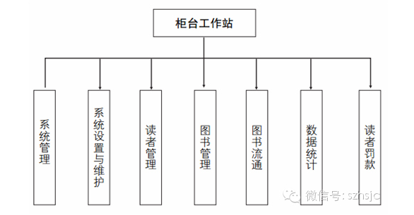柜台工作站类似于现在条形码+磁条数字图书馆管理系统中的柜台工作站,是数字图书馆管理员工作使用的一个应用软件。主要有读者信息的管理和读者证的办理,图书信息的管理和借还,馆藏统计等功能。具体可分为系统管理、系统设置与维护、读者管理、图书管理、图书流通、数据统计和读者罚款七个功能模块(如图 5)。